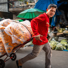 In den Straßen neben dem Markt spielt sich das „Liefergeschäft“ ab. Kleine LKW, Tuktuk-Lieferwagen und unzählige Lieferanten mit Sackkarren bringen die benötige Ware im Eiltempo.